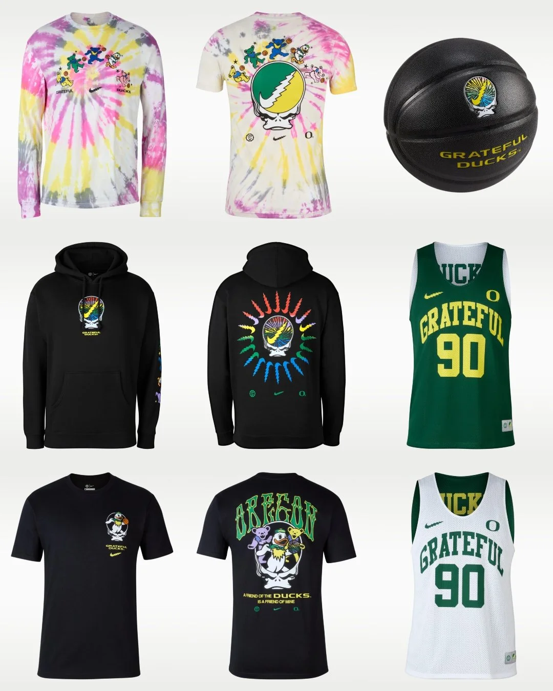 The collection — developed in partnership with creative label Class Trip — has grown into a full lifestyle universe that spans football, basketball, footwear, and fan apparel. The original October 2025 drop introduced the Nike Air Max 90 as its centrepiece, rendered in layered green and yellow hues inspired by Oregon's lush landscapes, with tie-dye accents, lightning bolt Swooshes, co-branded tongue tags, and custom sock liners nodding to the Dead's psychedelic iconography. The Grateful Dead's iconic Steal Your Face skull was reimagined as a duck — "Steal Your Duck" — becoming the collection's signature emblem across bomber jackets, hoodies, crew-neck sweatshirts, and tees. The February 27, 2026 chapter deepens the basketball angle, inspired by the Nike Sabrina 3 Grateful Ducks PE worn by the Oregon Ducks women's team in January, with a black basketball stamped with the lightning bolt skull logo in vibrant yellow leading a capsule of bold graphic tees, tie-dye long-sleeves featuring dancing bears alongside the Oregon duck mascot, reversible practice jerseys, and classic headwear.