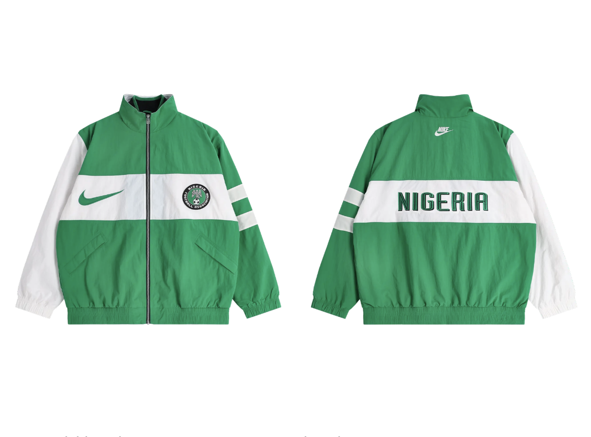 The reissue returns every detail that made the original a piece of football design history — the bold diagonal stripe running from shoulder to hip in the deep forest green and white that became synonymous with the Super Eagles' Atlanta campaign, the black accents that give the jacket its graphic edge and connect it to the broader visual identity that Nigeria wore through the tournament. The classic Nike template of the mid-nineties rendered in the track jacket construction of the era — snap buttons running the full length of the front, ribbed collar, cuffs, and hem in the fitted style that defined tournament warmup wear before performance fabrics changed the standard entirely. The Nigeria crest sits at the chest exactly as it did in 1996, the same position it occupied when the Super Eagles walked out into the Georgia heat and prepared to play football that matched their kit in ambition.