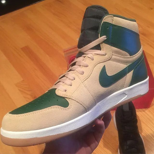 First previewed by wide-receiver Dez Bryant, the Air Jordan 1.5 "Sand Dune" seems to be here to stay. The prototype model has been dropping in many colorways since the debut "Chicago" colorway released, and it seems Jordan Brand is not done with the silhouette. An in-hand photo via BigKTheBoss reveals more details about the "Sand Dune" colorway. The hybrid sneaker fetures a tan leather upper that has various green tones throughout the sneaker. There are hints of red found on the Air Jordan "Wings" logo and Nike logo. The sneaker comes stock with tan laces with an alternative red lace option.