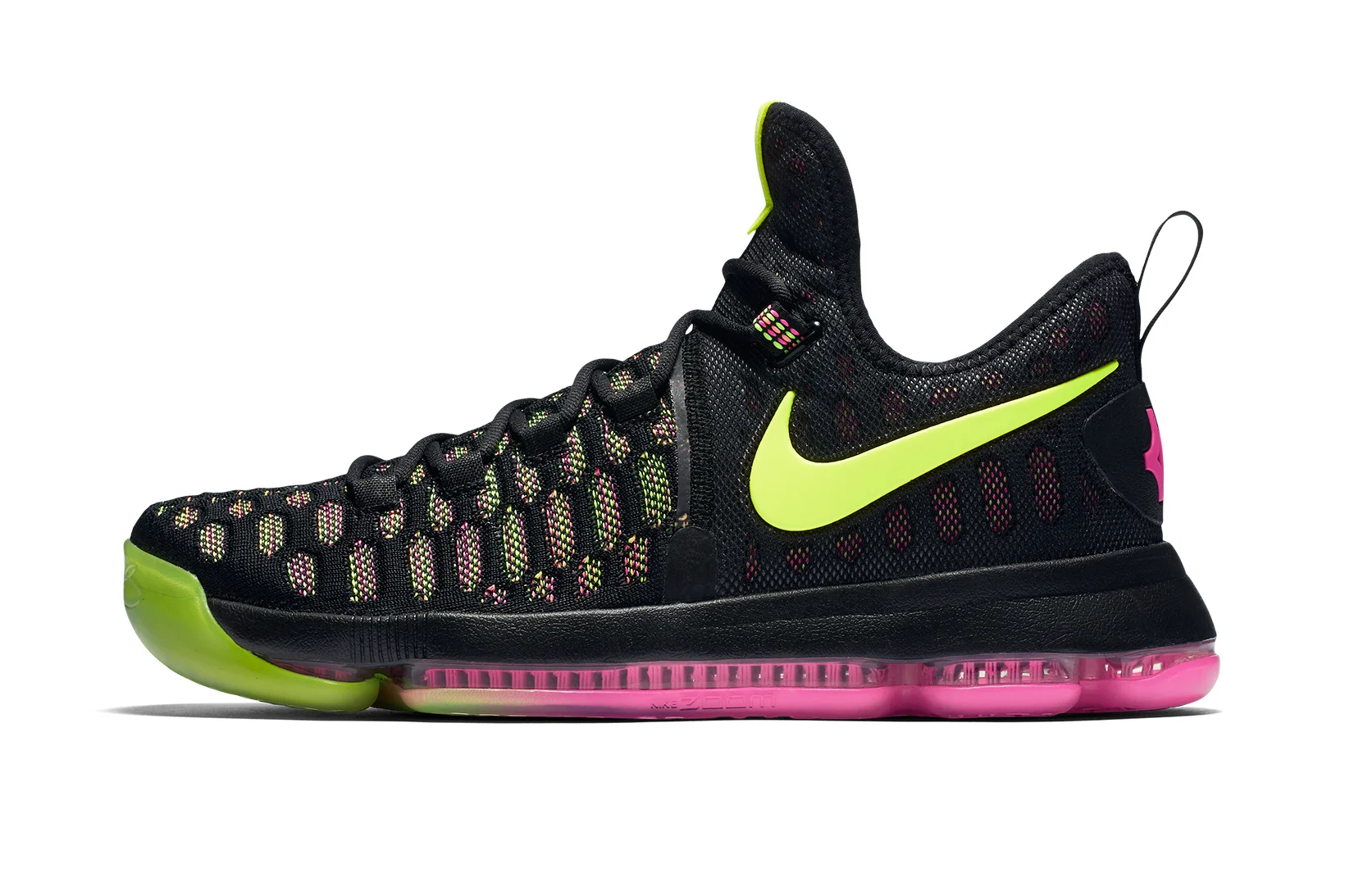 Kevin Durant will enter a new chapter in his basketball career wit the Golden State Warriors this upcoming NBA season. The Swoosh Brand is already planning some new colorways for his ninth signature sneaker. The upcoming Nike Zoom KD 9 "Unlimited" features a black Flyknit construction with mixes of volt and pink throughout the sneaker. Volt accents the Swoosh branding and toe cap while a gradient pink outsole adds the final touches.
