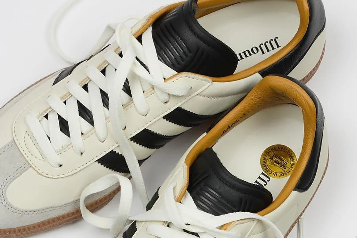 In partnership with JJJJound, these sneakers embody adidas' original football legacy in a luxurious package, reflecting the Montreal-based design studio's dedication to minimalist aesthetics. Premium leather forms the upper, complemented by suede overlays for a striking contrast. The rubber outsole, serrated 3-Stripes, and T-toe design pay homage to the timeless Samba silhouette. Additionally, unique elements nod to the renowned Scheinfeld factory, located a short distance from adidas' global headquarters in Herzogenaurach, Germany.