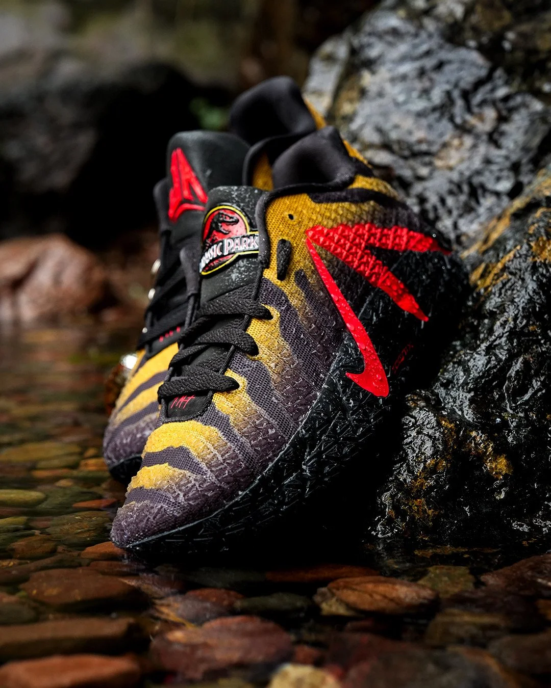 The anthracite base sets the tone immediately — a dark, predatory foundation across the Ja 3's breathable mesh upper that the yellow ochre overlays cut through in jagged, textured patterns referencing raptor skin, the gradient fading from gold to near-black in the kind of color shift that rewards attention without demanding it. The layered build adds visual dimension that photographs as aggressive and wears as intentional, the texture sitting between scaled and claw-marked in the language of a franchise that has always known what its most compelling creature looks like in motion. A bright crimson Swoosh slices down the lateral panel with the sharp conviction of a design decision that makes the darker upper come alive — paired with a matching stylized "A" that completes Ja's signature branding in the color of something that has already made its move. Mismatched tongue branding — Ja Morant on one shoe, Jurassic Park on the other — connects both identities without forcing either to yield, the collaboration wearing both names with equal authority. Velociraptors printed across the insoles complete the narrative for the wearer who opens the box and looks inside.