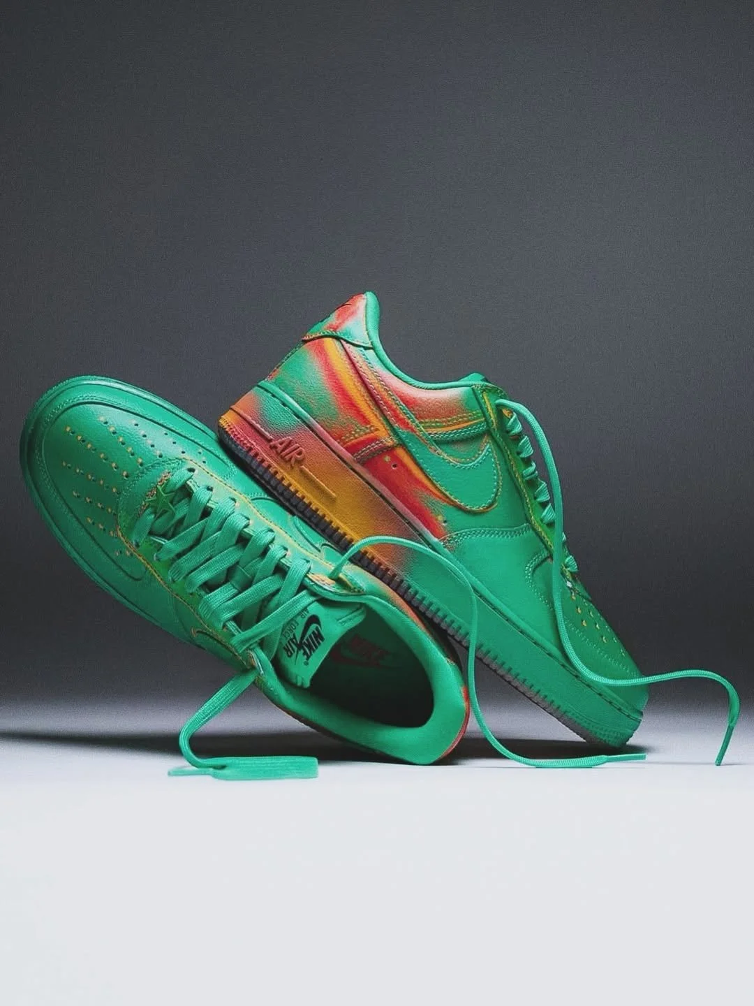 The premium leather base carries the spray paint effect with the glossy, smooth surface that gives the gradient its full visual range — the stadium green holding clean and saturated at the toe box before the warm tones begin their takeover, bleeding through the eyestays, wrapping around the Swoosh, and reaching full intensity at the heel where the bright crimson and laser orange land with the heat of a finish line crossed at speed. Yellow perforations at the toe box add a dimension that only becomes visible up close, the color threaded through the AF1's most familiar detail in a tone that ties the warmth of the heel to the cool of the front in the shoe's most subtle design decision. Star-shaped lace dubraes and a green midsole keep the build grounded, the semi-gum outsole completing the release with a classic touch that the experimental upper earns rather than borrows.