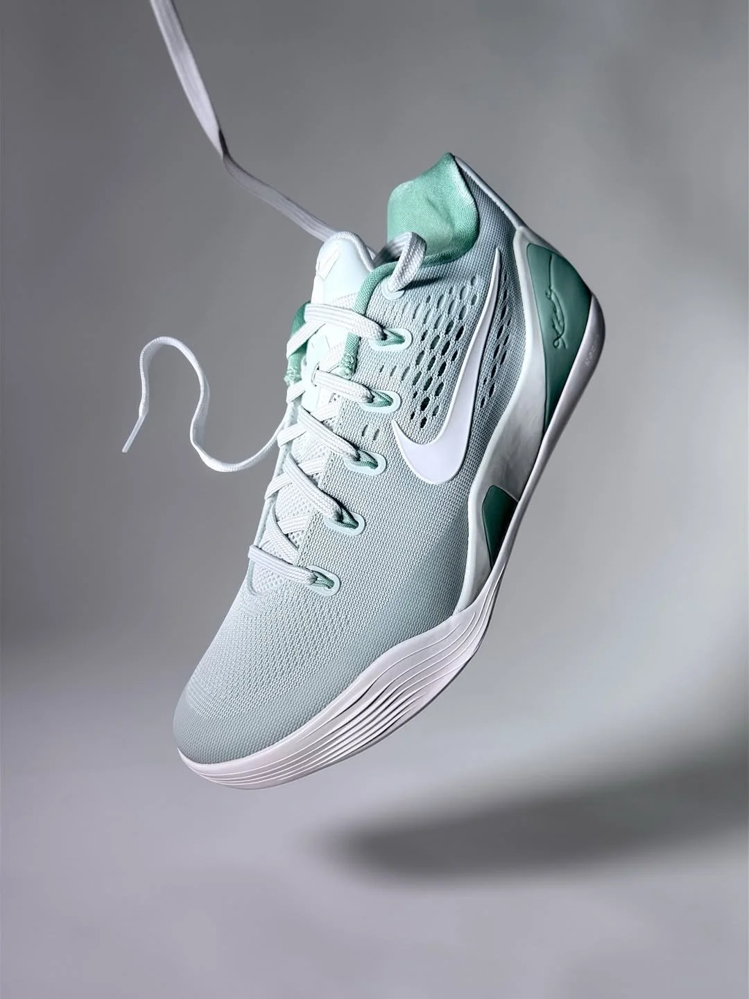 The light silver engineered mesh upper carries the Kobe 9 Low's sleek, low-profile construction in a tone that reads clean and neutral under court lighting — a base that recedes exactly as much as it needs to in order to let the steam green accents do their precise, considered work. The soft sage green arrives at the heel counter, Flywire cables, sockliner, and lace loops in the color that gives the colorway its name — muted enough to read as silver from a distance, distinct enough to reward the close look that the "Steam" colorway was built for. The Kobe shield logo and Swoosh land in the same tonal restraint, present without competing, the branding as quiet as the palette demands. A summit white outsole completes the build from the ground up with the clean underfoot finish that the light silver above it requires.