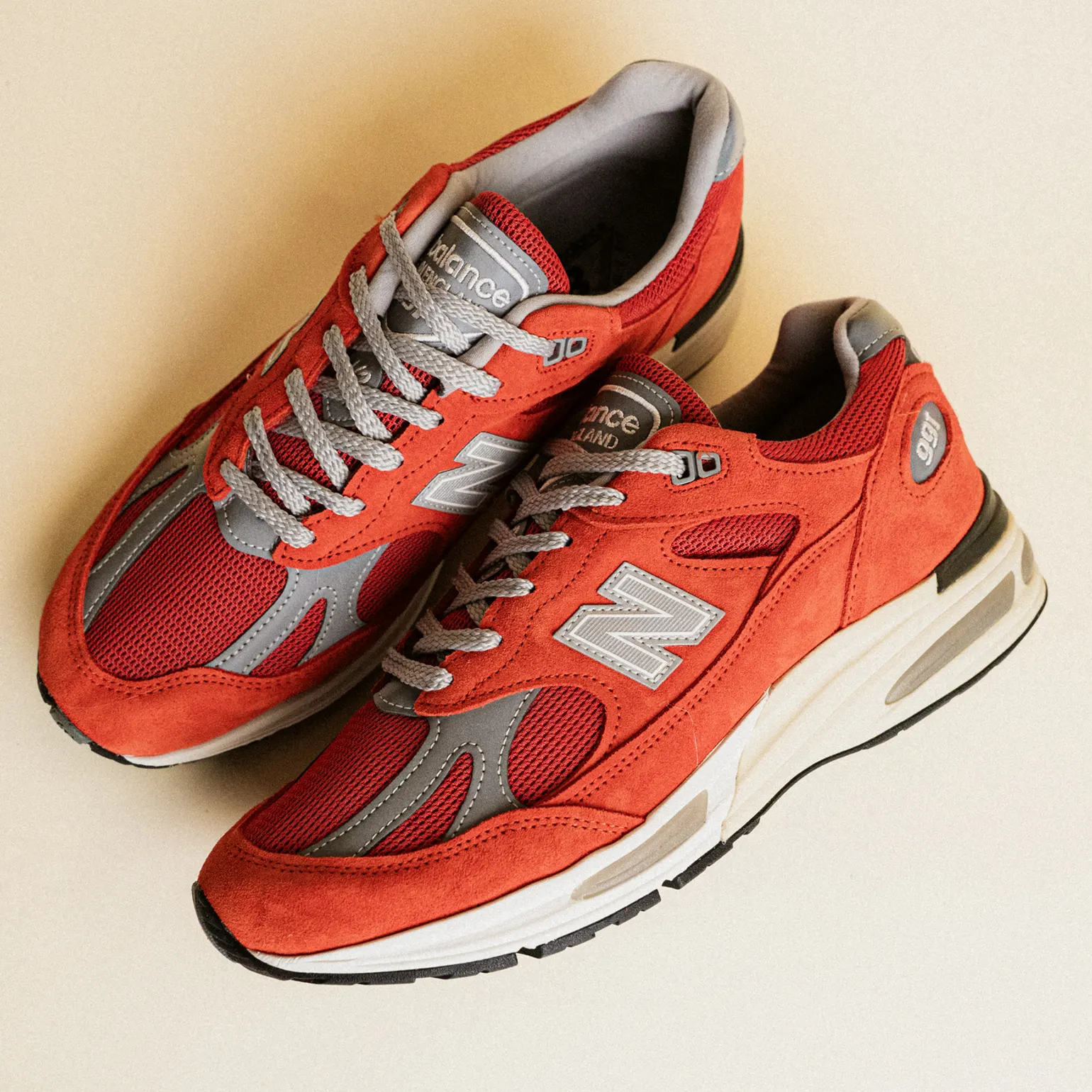 The vivid orange premium suede commands the mudguard, eyestays, heel, and side panels with the saturated warmth of a palette chosen without hesitation — a "Fire Whirl" that moves across the upper's dominant surfaces at full intensity rather than filtered through any instinct toward restraint. Beneath the suede overlays, a slightly darker orange mesh provides the base layer, the tonal variation between the two adding depth and visual texture that keeps the color story from ever reading as flat — the 991v2's famously complex layered construction doing exactly what it was built to do, turning material and color into a conversation rather than a statement. Muted grey arrives at the oversized N logos, laces, tongue branding, heel tabs, and forefoot overlays with the composed authority of the color that has always grounded the New Balance palette — the grey not competing with the orange but clarifying it, the way the right neutral sharpens everything it frames. A cream and off-white midsole carries the cushioning stack underfoot, the FuelCell full-length foam and ENCAP stability technology and ABZORB SBS pods delivering the lifted, responsive, all-day comfort that the 991v2's update over the original most meaningfully advanced. A black rubber outsole with a discreet blue FuelCell panel finishes the build from the ground up.