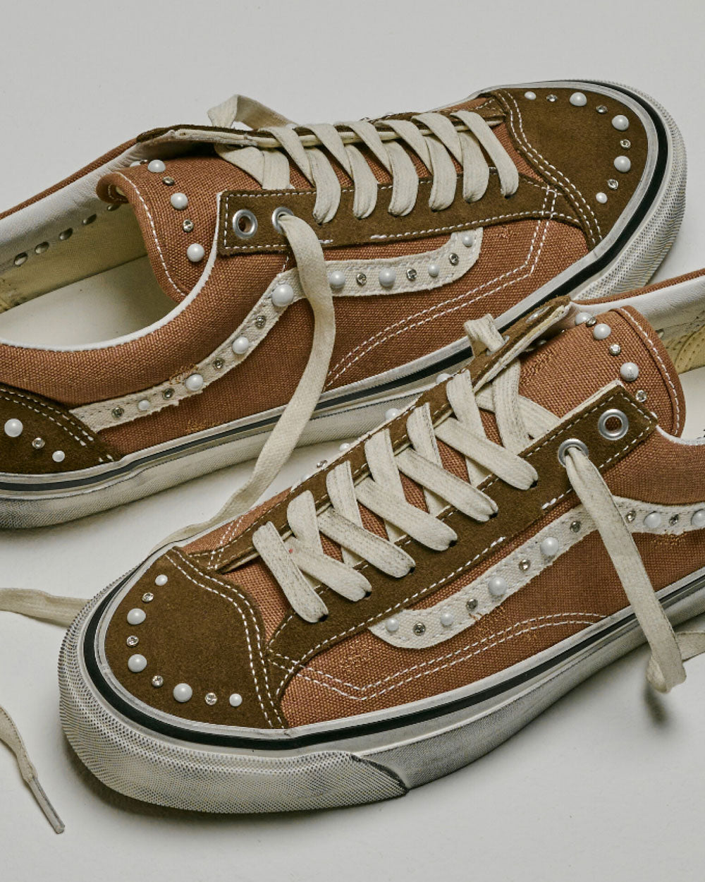 Two shades of brown move across the Old Skool 36's premium construction in a material dialogue that rewards the closer look — cocoa brown suede covering the toe box, heel, and lace panel with the tactile depth that only genuine suede provides, while a matching brown canvas takes the side panels and tongue in the slightly different texture that makes the single-color palette read as layered rather than flat. The Sidestripe arrives in white — the one break from the brown palette that grounds the entire shoe in the Old Skool's most recognizable design detail, the wave that has defined the silhouette's identity for nearly five decades — while white laces and a pre-distressed white midsole complete the build with the worn-in character that the Pearlized series has made its consistent signature. Then come the pearls and crystals, distributed across the toe box, tongue, heel, and the full length of the Sidestripe on both lateral and medial sides — the embellishment that transforms the "Vintage Cocoa" from a beautifully constructed brown Old Skool into something that sits at the precise intersection of skate heritage and understated luxury, the gems catching light the way nothing about this colorway's earthiness would otherwise suggest.